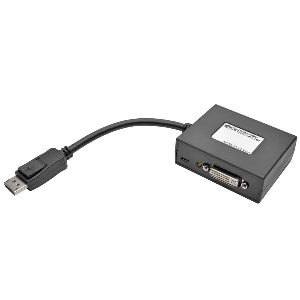 The B157-002-DVI 2-Port DisplayPort to DVI Splitter converts and splits a DisplayPort video signal for display on two DVI-enabled monitors, projectors or televisions at the same time. Ideal for offices, conference rooms, retail settings, trade shows and classrooms, this compact splitter features a built-in DisplayPort cable that connects to the source. It lets you use your existing DVI displays instead of buying new DisplayPort monitors or docking stations.