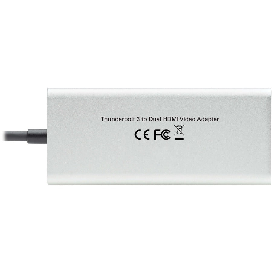 Tripp Lite MTB3-002-HD Dual-Monitor Thunderbolt 3 to HDMI Adapter (M/2xF) - 4K 60 Hz, 4:4:4, Silver. USB version: Thunderbolt 3, USB connector type: USB Type-C, USB connector gender: Male. Product colour: Grey, USB cable length: 0.26 m. Windows operating systems supported: Windows 10. Package width: 132.1 mm, Package depth: 165.1 mm, Package height: 25.4 mm. Products per master (outer) case: 10 pc(s), Master (outer) case width: 142.2 mm, Master (outer) case length: 256.5 mm
