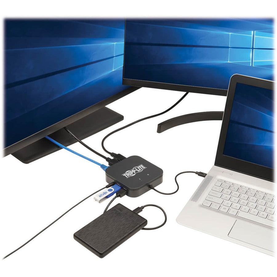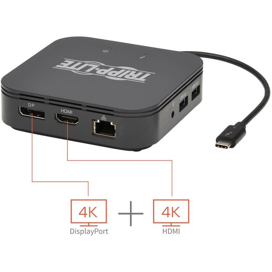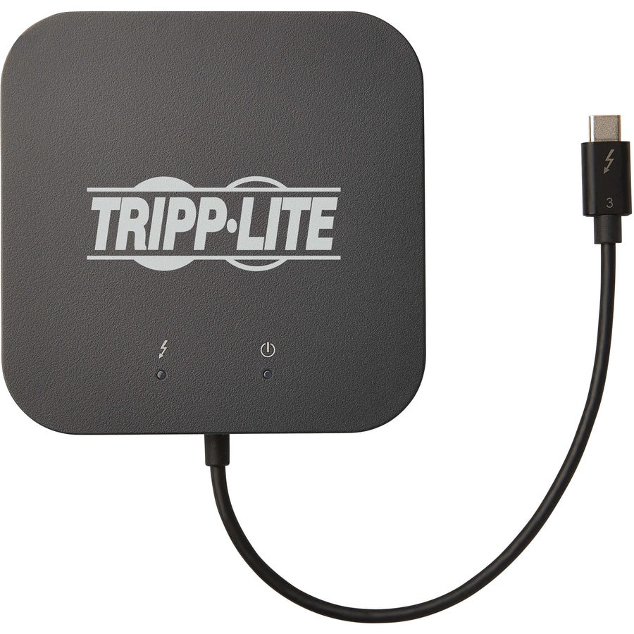 Tripp Lite MTB3-DOCK-04 Thunderbolt 3 Dual Monitor Docking Station - 8K/30Hz DisplayPort, 4K/60Hz HDMI, USB 3.1 Gen 2, GbE, 60W PD Charging - Black. Connectivity technology: Wired, Host interface: Thunderbolt 3, USB Power Delivery up to: 60 W. Ethernet LAN data rates: 1000 Mbit/s. Product colour: Black, Data transfer rate: 40 Gbit/s, HD type: 8K Ultra HD. Power source type: Thunderbolt 3. Width: 106 mm, Depth: 106 mm, Height: 25 mm