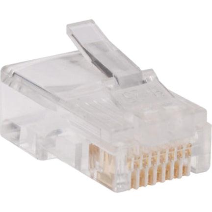 Tripp Lite N030-100 RJ45 Plugs for Round Solid / Stranded Conductor 4-pair Cat5e Cable, 100-Pack. Connector(s): RJ45, Product colour: Transparent. Quantity per pack: 100 pc(s). Package width: 177.8 mm, Package depth: 12.7 mm, Package height: 228.6 mm. Country of origin: China, Master (outer) case width: 249.9 mm, Master (outer) case length: 25.4 mm