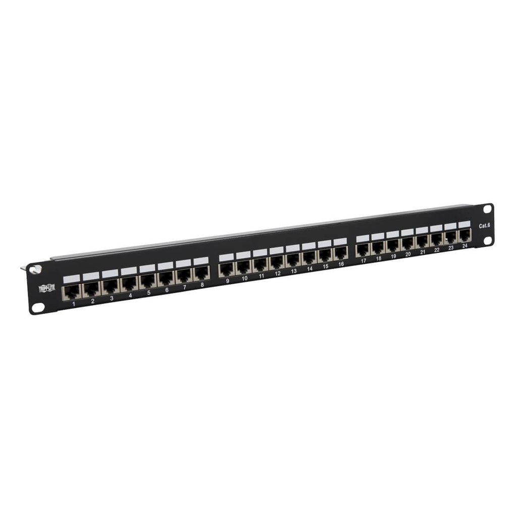 Shielded 24-Port Patch Panel Organizes and Manages High-Speed Cat6 Network Cabling Manage your high-density Cat5e/6 application without taking up too much valuable rack space. The N252-024-SH-K offers 24 fully shielded RJ45 ports with color-coded Krone IDC slots that are terminated using a proper punch-down tool. The patch panel supports T568B wiring standards and is fully rated for 5 Gbps data transfer speeds in your Ethernet application. Both the rear and front connectors are numbered and labeled for custom naming to help you identify individual cable runs at a glance.