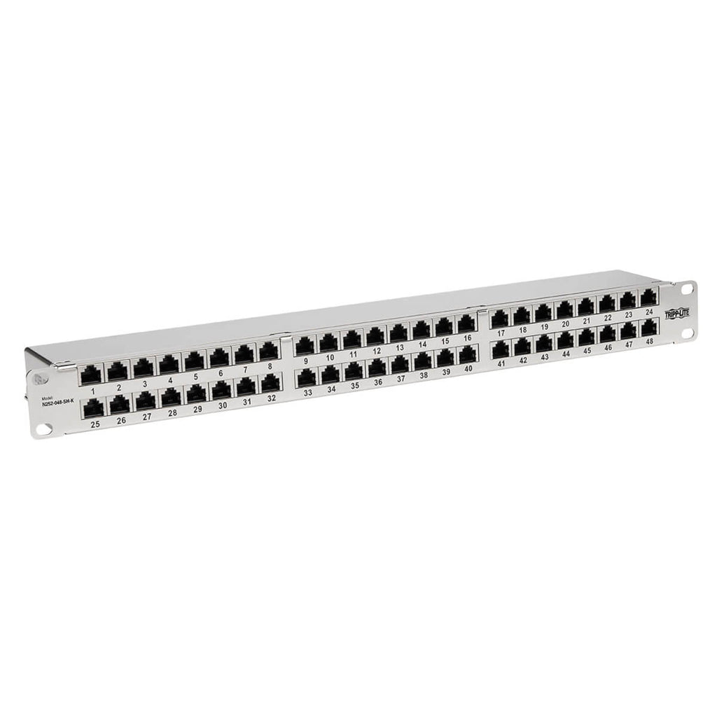 Tripp Lite N252-048-SH-K Cat5e/Cat6 48-Port Patch Panel - Shielded, Krone IDC, 568A/B, RJ45 Ethernet, 1U Rack-Mount, TAA. Maximum data transfer rate: 5000 Mbit/s, Connector(s): RJ-45, Cable types supported: Cat5,Cat5e,Cat6. Product colour: Silver, Mounting: Rack mounting, Rack capacity: 1U. Package width: 104.1 mm, Package depth: 518.2 mm, Package height: 55.9 mm. Country of origin: Taiwan, Master (outer) case width: 299.7 mm, Master (outer) case length: 523.2 mm