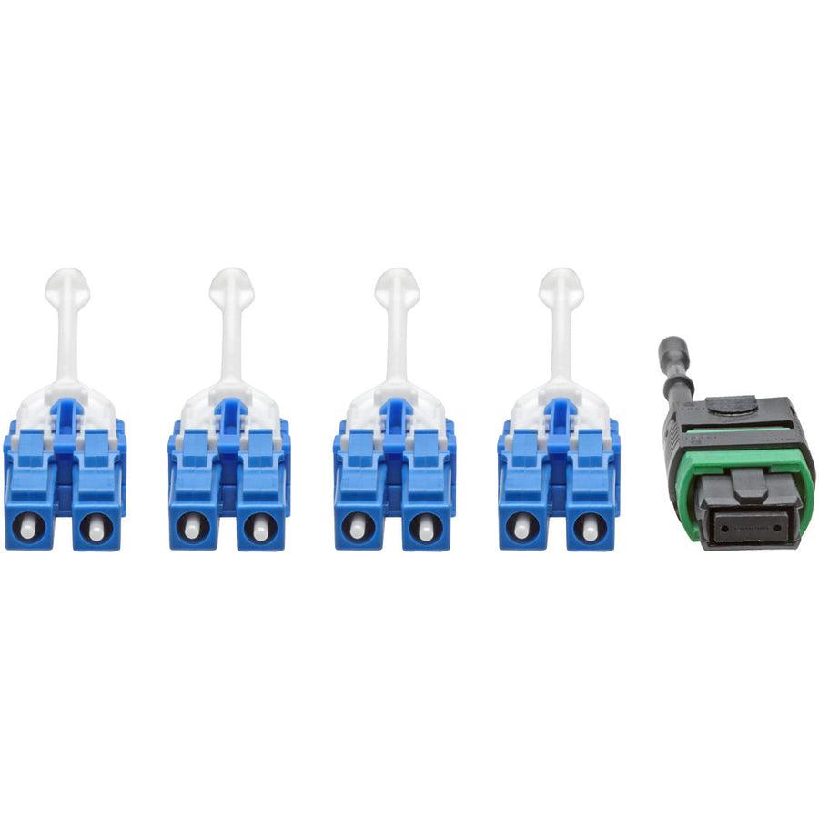 MTP/MPO APC and LC Duplex UPC Connectors with Push/Pull Tabs MTP/MPO female connector and 8 LC duplex male connectors—no splicing required 12-fiber MTP/MPO connector 12 times denser than SC connector APC connector angled to prevent light from reflecting back into laser UPC connector with premium-grade ceramic ferrule for 10 GbE and faster applications Push/pull tabs easy to install and remove with one hand