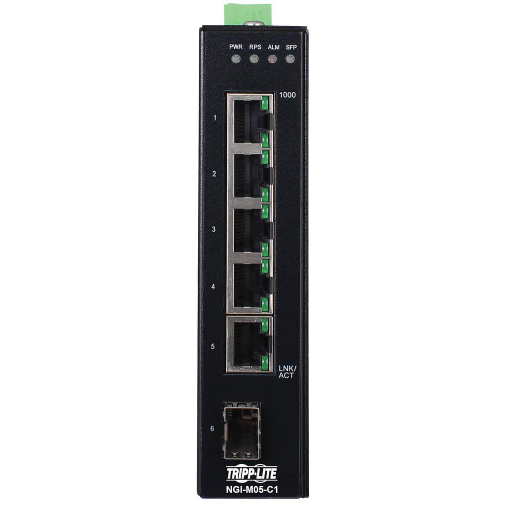 5-Port Managed Gigabit Ethernet Switch Connects Your Network Devices to a LAN This space-saving Tripp Lite switch transmits data over a Gigabit Ethernet network. Five auto-negotiating 10/100/1000 Mbps ports send data via Cat5e/6/6a cable only to the devices designated to receive it, which improves the efficiency and potential throughput of the network. The NGI-M05-C1 also features a GbE SFP slot for uplinking data to other switches via optical fiber or copper. LEDs indicate when the switch is powered on and which Ethernet ports are showing activity.