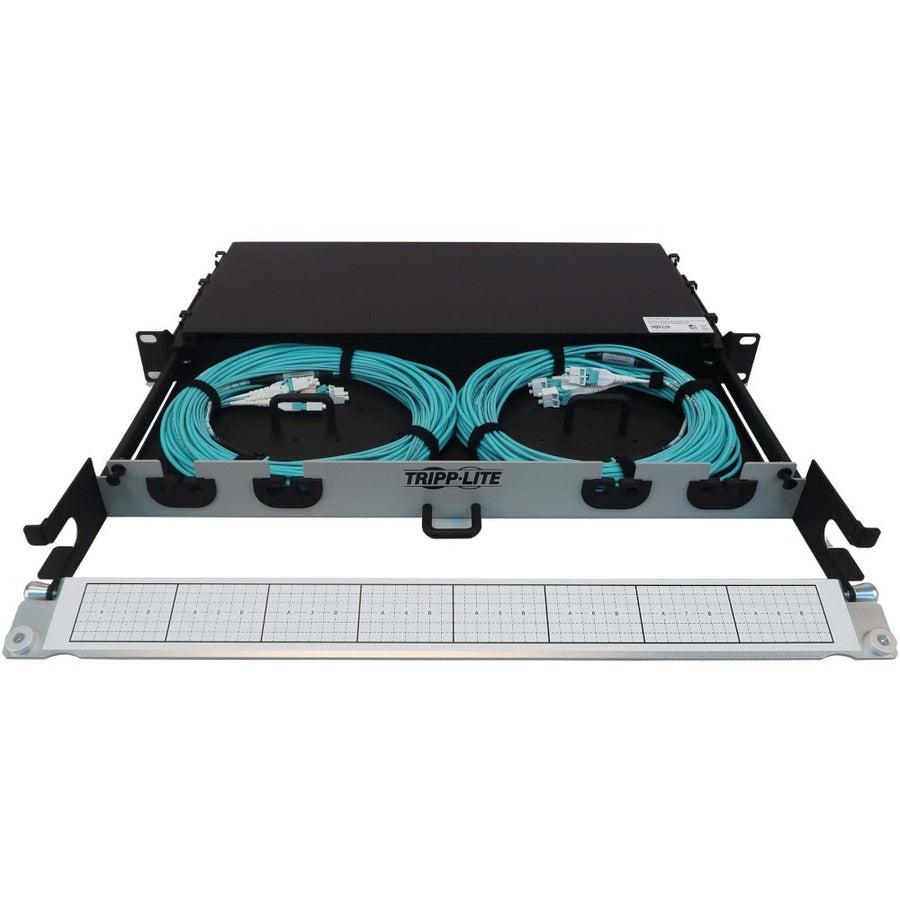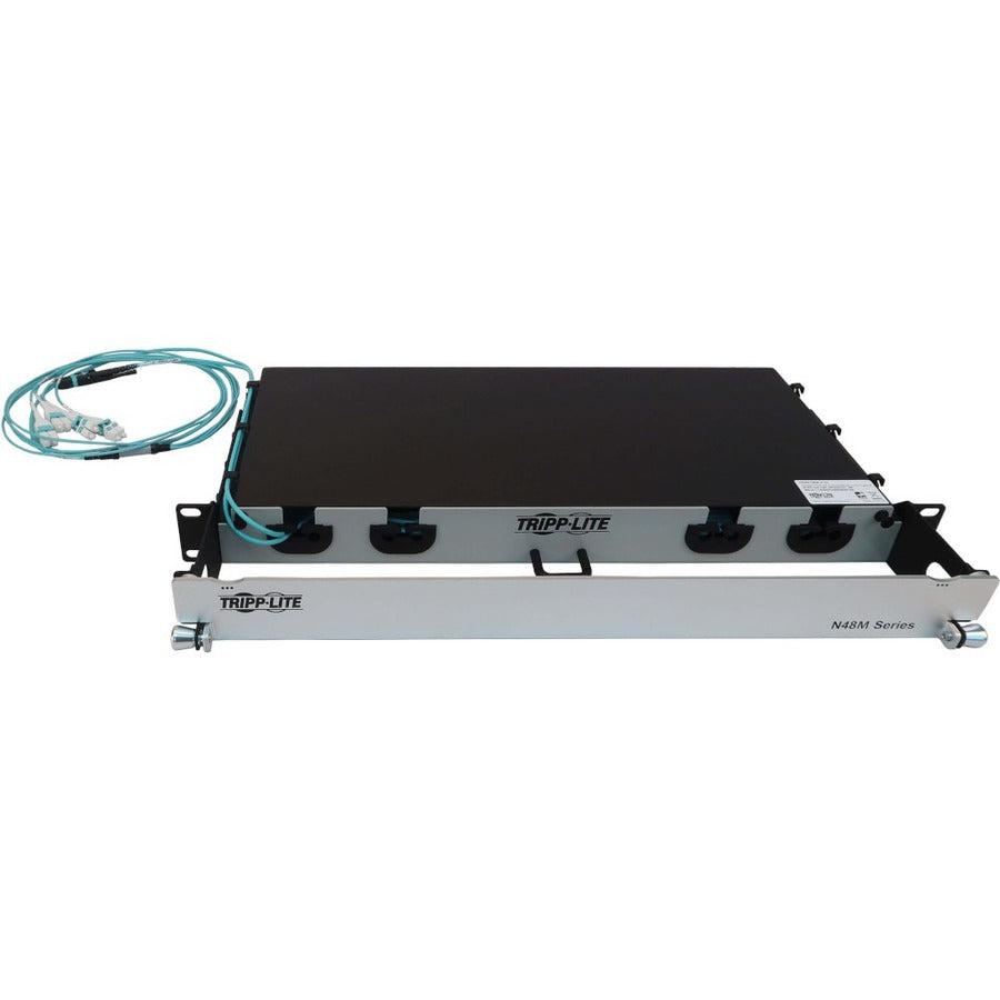 1U Panel Solution Comes with Cabling Preloaded to Cut Costs and Save Time All necessary cabling is included with this preloaded fiber panel, coiled inside and ready for immediate use. The aluminum 1U chassis features two 8-fiber MTP/MPO-PC to LC Duplex multimode trunk cables, both 20 meters (65.6 feet) in length to make management easy. The panel opens to provide easy access to stored cables. Use only as much cabling as you need. The remainder stores inside the chassis to eliminate cable clutter, allow better airflow through the rack and make equipment maintenance and replacement easier. The cables and panels have labels to help with organization. You also avoid the expense and effort of custom cabling. The flexibility in cable length lets you reuse the cables if equipment is moved. The N48M-2M8L4-20 mounts in just 1U of space in an EIA-standard 19-inch rack.