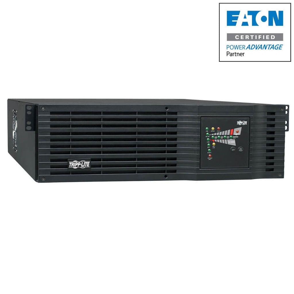 Tripp Lite Smart Online UPS systems offer high performance power protection ideal for critical server and network equipment in datacenters, computer rooms and network closets. Online, double-conversion Uninterruptible Power Supply (UPS) maintains perfectly regulated output power by continuously converting raw AC input to DC, then re-converting output back to AC. Fully regulated sine wave AC output with +/-2% voltage regulation powers network equipment continuously, even during severe brownouts and overvoltages, all without depleting UPS battery reserves. Maintains battery-derived AC output during power failures with zero transfer time. Extended runtime options available. High 98% efficient operation in optional economy mode saves BTU heat output and energy costs. Network management interfaces support communications via USB, RS-232, contact-closure and PRE-INSTALLED SNMPWEBCARD network interface. Built-in DB9 port offers both enhanced RS-232 data and basic contact closure monitoring ability. HID-compliant USB interface enables integration with built-in power management and auto shutdown features of Windows and Mac OS X. Includes PowerAlert monitoring software and complete cabling. Emergency Power Off (EPO) interface. LED display reports UPS operating mode, line power availability, battery mode operation, inverter operation and output power availability. Audible alarm with push-button momentary alarm-cancel. Programmable self-test. Battery independent restart. Fault-tolerant auto-bypass mode. Field-replaceable, hot-swappable internal batteries and external battery packs. - Tripp Lite SU3000RTXL3UN 3000VA / 3kVA / 2400W on-line, double-conversion 3U rackmount UPS - Selectable 110/120V output (120V factory preset) - NEMA L5-30P input, 4 NEMA 5-15/20R, 4 5-15R & 1 L5-30R outlets - Two switched 4-outlet load banks support remote reboot or programmable load shedding options - Supports 2% output voltage regulation and zero transfer time in double conversion mode - Economy mode option offers enhanced 98% efficiency operation, reduced power consumption and lower BTU emissions - 14 minutes runtime at 50% load (1200W) and 5 minutes at 100% load (2400W) with internal batteries - BP72V15-2U (limit 1), BP72V28RT-3U (multi-pack compatible) and BP72V18-2US (multi-pack compatible) external battery packs available (some configurations require Tripp Lite's External Battery Configuration Software) - LED Display reports UPS operating mode, line power availability, battery mode operation, inverter status and output power availability - Audible alarm with push-button momentary alarm-cancel - 4 post installation hardware included, Optional 2POSTRMKITHD enables 2 post rack installation - Single line TEL / Network surge suppression - Electronic bypass maintains utility output during a variety of UPS fault conditions - Battery independent restart ensures automatic UPS power-up without user interaction after lengthy power outages, even when batteries are expired and require replacement - Built-in USB, RS-232, contact-closure and PRE-INSTALLED SNMPWEBCARD network interface - HID-compliant USB interface enables integration with built-in power management and auto shutdown features of Windows and Mac OS X - Included PowerAlert UPS monitoring software