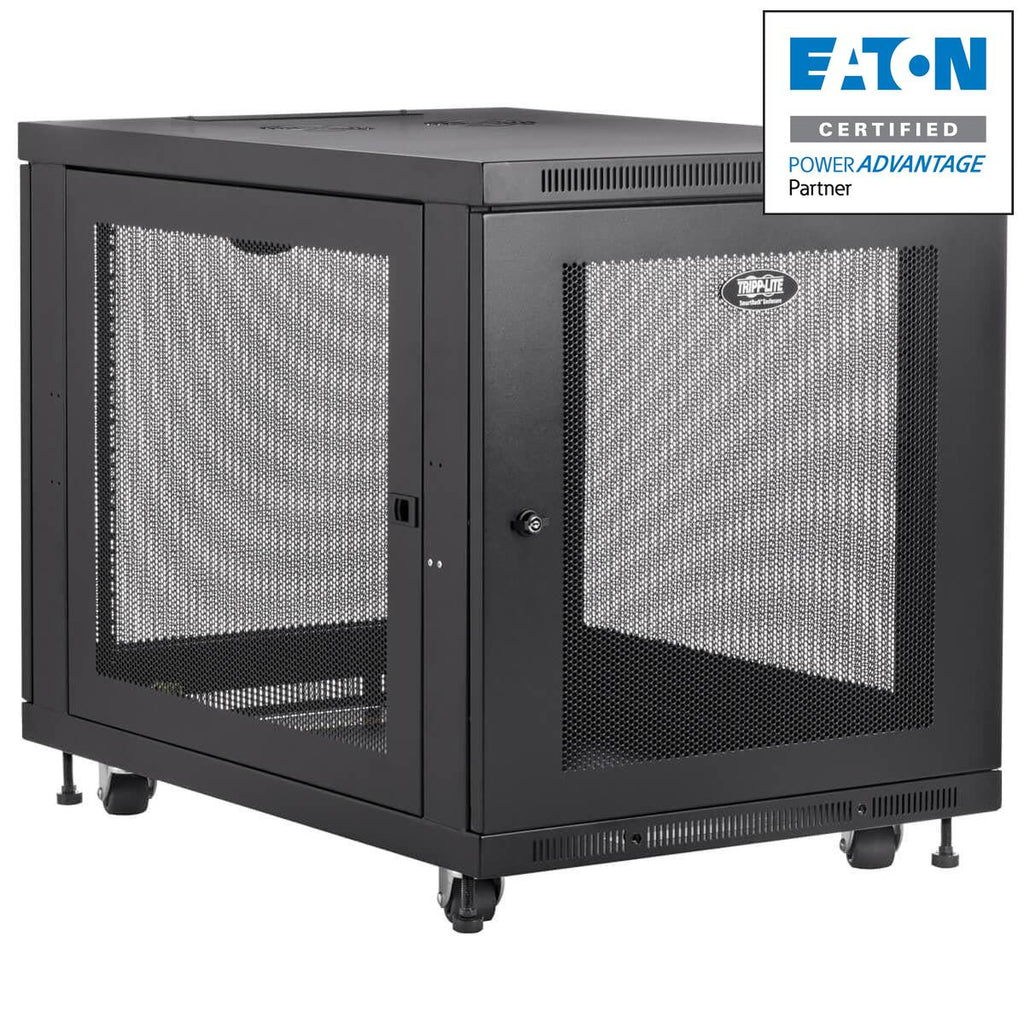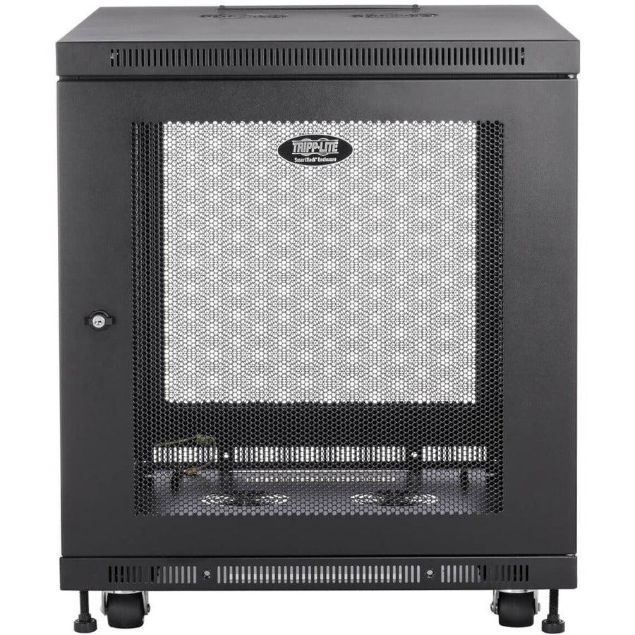 Tripp Lite's SmartRack 12U Mid-Depth Rack Enclosure Cabinet is designed to simplify rack equipment installations and rack equipment maintenance. Compatible with all standard 19-inch rack equipment, it features front and rear pairs of vertical rails with square mounting holes. The rails are adjustable in quarter-inch increments to accommodate equipment depths from 3 to 32.5 inches, ideal for standard server installation. The rails are capable of supporting up to 1000 lbs (453.6 kgs) of equipment. The top and bottom panels are provided with ports for cable routing, and are furnished with vents designed to help remove warm air from the enclosure and draw in cool air by convection. The panels also support installation of standard user-supplied case fans (Tripp Lite SRFANWM). With a locking reversible front/rear doors and locking removable side panels, the SR12UB provides for the safe, secure installation of all equipment. To simplify deployment, the SR12UB comes with an accessory caster kit so it can easily be maneuvered into the desired location, and then secured in place by adjusting the unit's levelers. It ships fully assembled for quick installation.