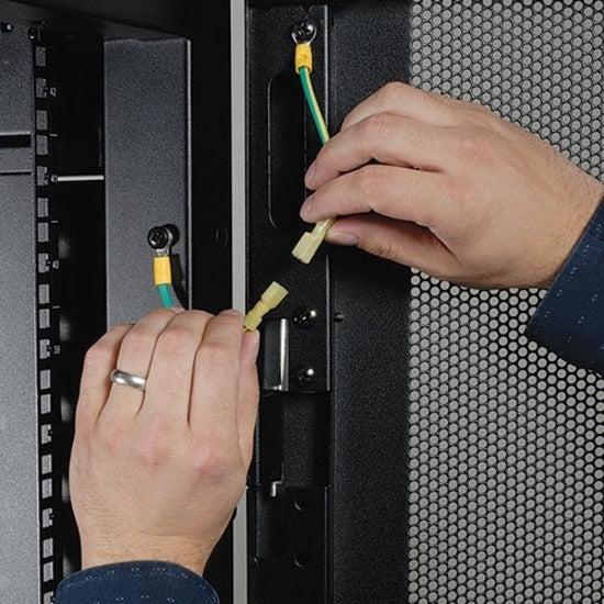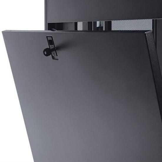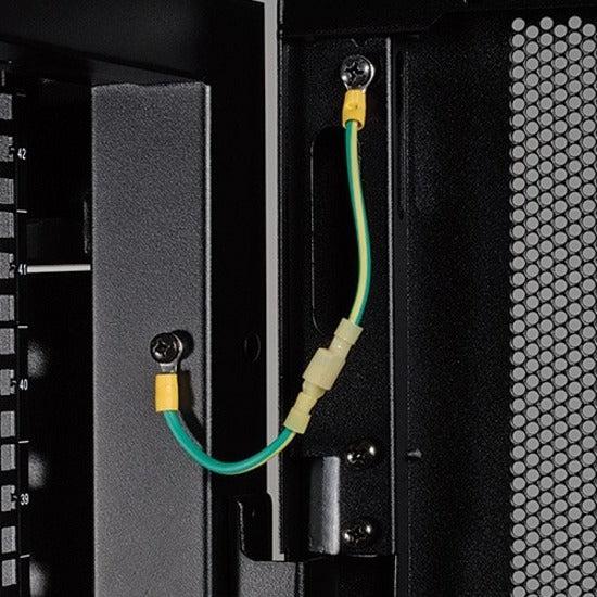 Ships fully assembled for rapid deployment and rolls into place on heavy-duty pre-installed casters (casters are removable) Front and rear sets of equipment mounting rails accommodate all standard 19-inch rackmount equipment and adjust in 1/4" increments. Adjustment is quick and convenient. The easy-view depth index ensures consistent rail placement without requiring time-consuming measurements. Toolless mounting brackets allow quick installation of compatible PDUs and vertical cable managers. Each rack can accommodate two vertical PDUs Rack Enclosure includes mounting hardware of 50 pieces of M6 cage nuts and 50 pieces of M6 screws Tough textured powder coat finish resists conditions found in non-IT environments such as warehouses Massive front-to-rear ventilation capacity. 65+% open space in door perforation pattern meets or exceeds server manufacturer requirements Maximum usable internal depth of 37 inches/94 cm (front to rear rail) Weight ratings of 2400 lbs (1088.6 kgs) stationary and 1600 lbs (725.7 kgs) rolling Front door is locking, reversible and removable Rear doors are locking and reversible. Split rear door design reduces clearance requirements for service entry allowing the enclosure to be placed closer to a wall Locking removable side panels are 'half size' to make them smaller and lighter improving ease of installation and servicing. Two side panels per side (4 panels total). Side panels are keyed alike to the front and rear doors. Built in baying tabs allow enclosures to be combined securely in rows. Center-to-center width can be set at 600mm or 24" to match standard data center floor tiles Leveling feet extend to allow enclosure to be positioned on uneven floors. Levelers are removable Compact design allows the enclosure to roll through standard height commercial doorways Convenient grounding system. All components are grounded to the enclosure frame which includes multiple connections for facility ground. Front and rear doors include quick-release ground wires. Open bottom for cable access Top panel has generous cable access holes. Panel can be removed toollessly in seconds without having to disconnect cables first Stabilizing brackets are used for shipment and can be reattached at the bottom of the enclosure frame on the inside or outside of the rack Meets all enclosure requirements towards PCI DSS (Payment Card Industry Data Security Standard) Compliance Compatible with airflow optimization and cable management accessories