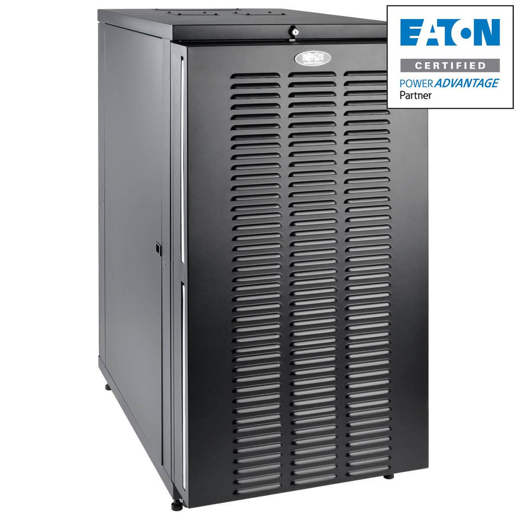 Eight high-performance fans are built into the door to pull air through the enclosure and keep your equipment cool. Dust- and drip-resistant top and bottom ports allow easy cable routing through the enclosure. To ensure your valuable equipment stays secure, the reversible front and rear doors and removable side panels lock tight.