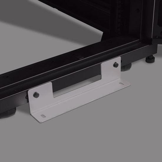 Ships fully assembled for rapid deployment and roll into place on pre-installed casters that support a rolling load capacity of 2250 lbs (1020.6 kgs), allowing the enclosures to be pre-configured and rolled to the final installation location. (Casters are removable.) Front and rear sets of equipment mounting rails adjust in 1/4" increments. Adjustment is quick and convenient. The easy-view depth index ensures consistent rail placement without requiring time-consuming measurements. Toolless accessory mounting rails (2 rails per enclosure) include slots for quick installation of compatible PDUs and vertical cable managers. Mounting slots are arranged in an industry-standard pattern compatible with a wide variety of accessories. Each rail can accommodate two vertical PDUs or cable managers side-by-side (four items per enclosure). Enclosure includes mounting hardware of 50 pieces of M6 cage nuts and 50 pieces of M6 screws Textured powder coat finish for tough resistance to environmental concerns such as deployment in warehouses. Massive front to rear ventilation capacity. 65+% open space in door perforation pattern meets or exceeds server manufacturer requirements. Maximum usable internal depth of 37 inches/94 cm (front to rear rail). Weight ratings of 3000 lbs (1360.8 kgs) stationary and 2250 lbs (1020.6 kgs) rolling. Front door is locking, reversible and removable. Rear doors are locking and reversible. Split rear door design reduces clearance requirements for service entry allowing the enclosure to be placed closer to a wall. Locking removable side panels are 'half size' to make them smaller and lighter improving ease of installation and servicing. Two side panels per side (4 panels total). Side panels are keyed alike to the front and rear doors. Built in baying tabs allow enclosures to be combined securely in rows. Center-to-center width can be set at 600mm or 24" to match standard data center floor tiles. Leveling feet extend to allow enclosure to be positioned on uneven floors. Levelers are removable. Convenient grounding system. All components are grounded to the enclosure frame which includes multiple connections for facility ground. Front and rear doors include quick-release ground wires. Open bottom for cable access. Top panel has generous cable access holes. Panel can be removed toollessly in seconds without having to disconnect cables first. Included stabilizing brackets are used for shipment and can be reattached at the bottom of the enclosure frame on the inside or outside of the rack. Meets all enclosure requirements towards PCI DSS (Payment Card Industry Data Security Standard) Compliance Compatibility with airflow optimization accessories as well as cable management accessories.