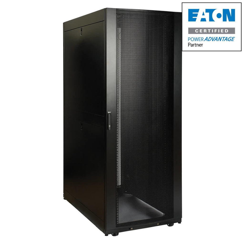 Ships fully assembled for rapid deployment and roll into place on heavy-duty pre-installed casters (casters are removable) Front and rear sets of equipment mounting rails adjust in 1/4" increments. Adjustment is quick and convenient. The easy-view depth index ensures consistent rail placement without requiring time-consuming measurements. Toolless accessory mounting rails (2 rails per enclosure) include slots for quick installation of compatible PDUs and vertical cable managers. Mounting slots are arranged in an industry-standard pattern compatible with a wide variety of accessories. Each rail can accommodate two vertical PDUs or cable managers side-by-side (four items per enclosure). Enclosure includes mounting hardware of 50 pieces of M6 cage nuts and 50 pieces of M6 screws Textured powder coat finish for tough resistance to environmental concerns such as deployment in warehouses. Massive front to rear ventilation capacity. 65+% open space in door perforation pattern meets or exceeds server manufacturer requirements. Maximum usable internal depth of 42 inches/1050mm (front to rear rail). Weight ratings of 3000 lbs (1360.8 kgs) stationary and 2250 lbs (1020.6 kgs) rolling. Front door is locking, reversible and removable. Rear doors are locking and reversible. Split rear door design reduces clearance requirements for service entry allowing the enclosure to be placed closer to a wall. Locking removable side panels are 'half size' to make them smaller and lighter improving ease of installation and servicing. Two side panels per side (4 panels total). Side panels are keyed alike to the front and rear doors. Built in baying tabs allow enclosures to be combined securely in rows. Center-to-center width can be set at 750mm or 30". Leveling feet extend to allow enclosure to be positioned on uneven floors. Levelers are removable. Convenient grounding system. All components are grounded to the enclosure frame which includes multiple connections for facility ground. Front and rear doors include quick-release ground wires. Open bottom for cable access. Top panel has generous cable access holes. Panel can be removed toollessly in seconds without having to disconnect cables first. Included stabilizing brackets are used for shipment and can be reattached at the bottom of the enclosure frame on the inside or outside of the rack. Meets all enclosure requirements towards PCI DSS (Payment Card Industry Data Security Standard) Compliance Compatibility with airflow optimization accessories as well as cable management accessories.