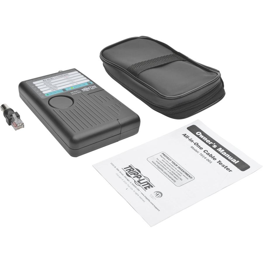 Tripp Lite T014-001 Network Cable Continuity Tester for Cat 5/Cat6/Cat6a, Phone, USB and Coax Cable Assemblies. Battery voltage: 9 V. Package width: 110 mm, Package depth: 45 mm, Package height: 183.9 mm. Cables included: BNC, Phone (RJ-11). Country of origin: China, Master (outer) case width: 199.9 mm, Master (outer) case length: 119.9 mm