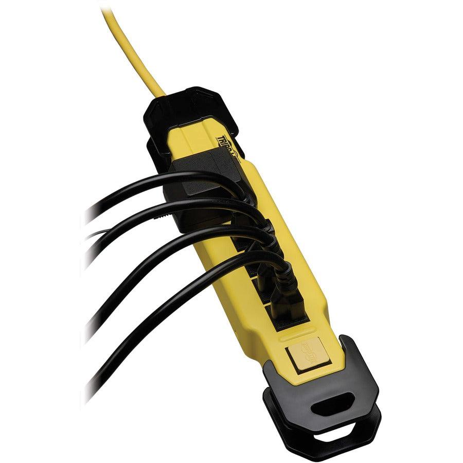 This Tripp Lite power strip is designed to safely distribute power to connected equipment in harsh environments. It provides a convenient source for multiple outlets wherever they're needed. 6 outlets distribute AC power to a wide range of power tools, drill presses, air compressors, power sanders and more. Convenient transformer outlets accommodate multiple transformers without blocking other outlets. A 9 ft. grounded cord with integrated cord clip reaches distant outlets. A GFCI plug protects users from electrical shock in wet or humid environments. A lighted on/off switch provides power control over connected equipment. 4 safety covers shield unused outlets from debris and accidental contact. A rugged metal case stands up to the harshest environments. Built-in cord wrap with hang holes provides convenient cord management. Integrated keyhole slots on bottom panel provide convenient wall/desk mounting. Lifetime limited warranty. Its bright yellow color alerts you and others that power cords and tools are in use.