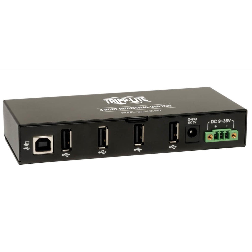 Tripp Lite U223-004-IND 4-Port Industrial-Grade USB 2.0 Hub - 15 kV ESD Immunity, Metal Housing, Mountable. Host interface: USB 2.0, Hub interfaces: USB 2.0. Data transfer rate: 480 Mbit/s, Product colour: Black, Housing material: Metal. Width: 139.7 mm, Depth: 63.5 mm, Height: 25.4 mm. Package width: 160 mm, Package depth: 231.1 mm, Package height: 76.2 mm. Master (outer) case width: 342.9 mm, Master (outer) case length: 480.1 mm, Master (outer) case height: 386.1 mm