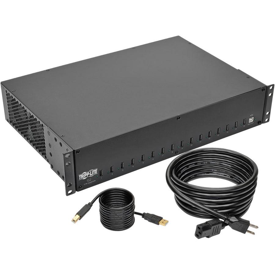 In addition to charging, the U280-016-RM2U syncs any USB device using its compatible software—Apple® iTunes® or Apple Configurator, for instance. An included USB cable attaches to the unit’s USB-B port and the USB-A port on a computer for syncing purposes.
