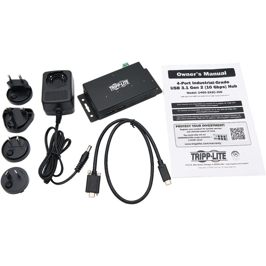 Tripp Lite U460-2A2C-IND Industrial-Grade 4-Port USB Hub - USB 3.1 Gen 2, 10 Gbps, 2 USB-A & 2 USB-C Ports, 15 kV ESD Immunity. Host interface: USB 3.2 Gen 2 (3.1 Gen 2) Type-C, Hub interfaces: USB 3.2 Gen 1 (3.1 Gen 1) Type-A, USB 3.2 Gen 2 (3.1 Gen 2) Type-C. Data transfer rate: 10000 Mbit/s, Product colour: Black, Housing material: Metal. Power consumption (typical): 1.75 W, Input voltage: 100 - 240 V, Input current: 0.6 A. Width: 107 mm, Depth: 64 mm, Height: 25 mm. Package width: 230.1 mm, Package depth: 198.1 mm, Package height: 63 mm