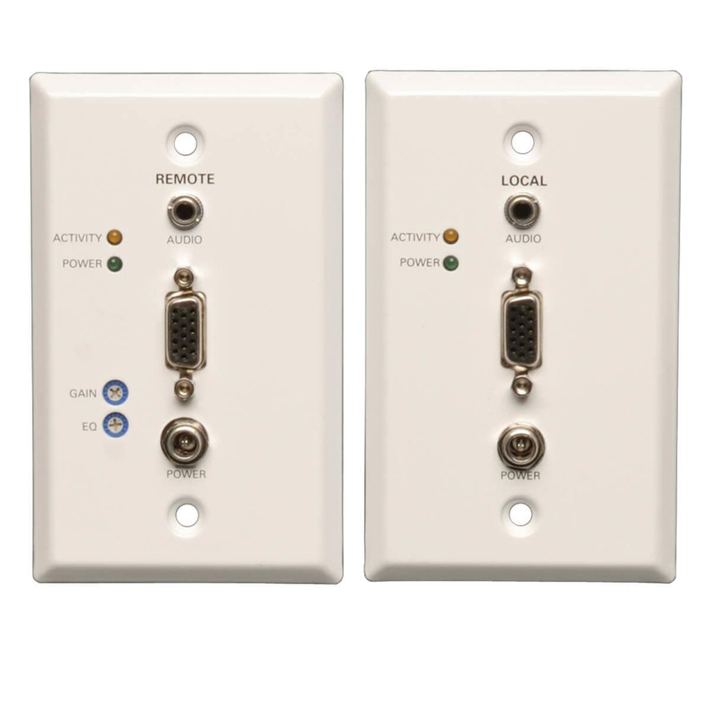Easy to Set Up and Use - Plug-and-play engineering—no software or drivers to download and install - Wallplate units eliminate cable clutter - LEDs indicate at a glance when the unit is receiving power - Included VGA + audio “Y” splitter cable allows connection of local monitor and speakers - Built-in equalization and gain controls lets you adjust the image on the remote monitor - Wall-mounting screws included - Supports all operating systems, as well as HDCP