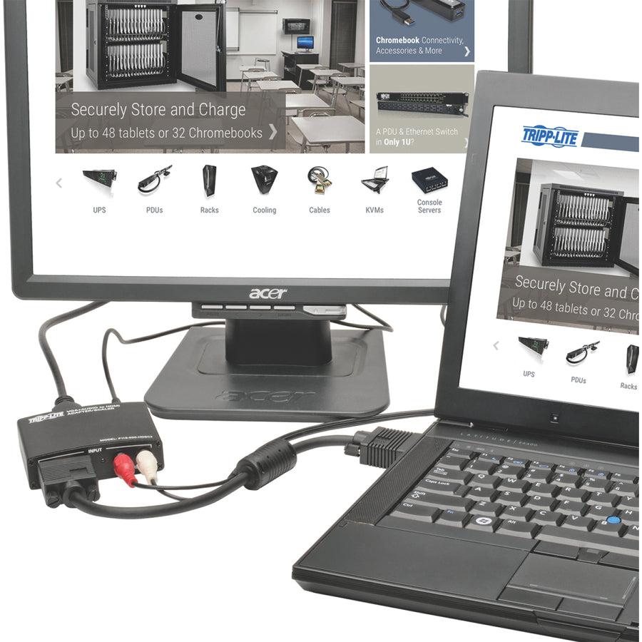 The P116-000-HDSC2 VGA with RCA Stereo Audio to HDMI Converter/Scaler saves you money on costly computer upgrades by converting and upscaling a VGA video signal for viewing on an HDMI display. The built-in scaler upgrades the VGA input signal, allowing you to display 720p or 1080p high-definition video in your home audio/video setups, media presentations or digital signage using your tried-and-true analog source equipment. The unit is ready to use right from the box with no software or drivers required. Connect the unit’s female VGA video and RCA stereo audio ports to your computer and the female HDMI port to your HDMI projector, monitor or television (VGA video and RCA stereo cables sold separately). The unit automatically upscales the video signal to 720p. Toggle the display to 1080p by pressing the button on the unit. In addition to high-definition video resolutions up to 1080p, the P116-000-HDSC2 supports computer input video resolutions up to 1920 x 1440 (@ 60 Hz), which are scaled to 720p or 1080p on the display. It also supports HDMI bandwidth of 165 MHz (1.65 Gbps per channel) and 24-bit True Color (8 bits per channel).