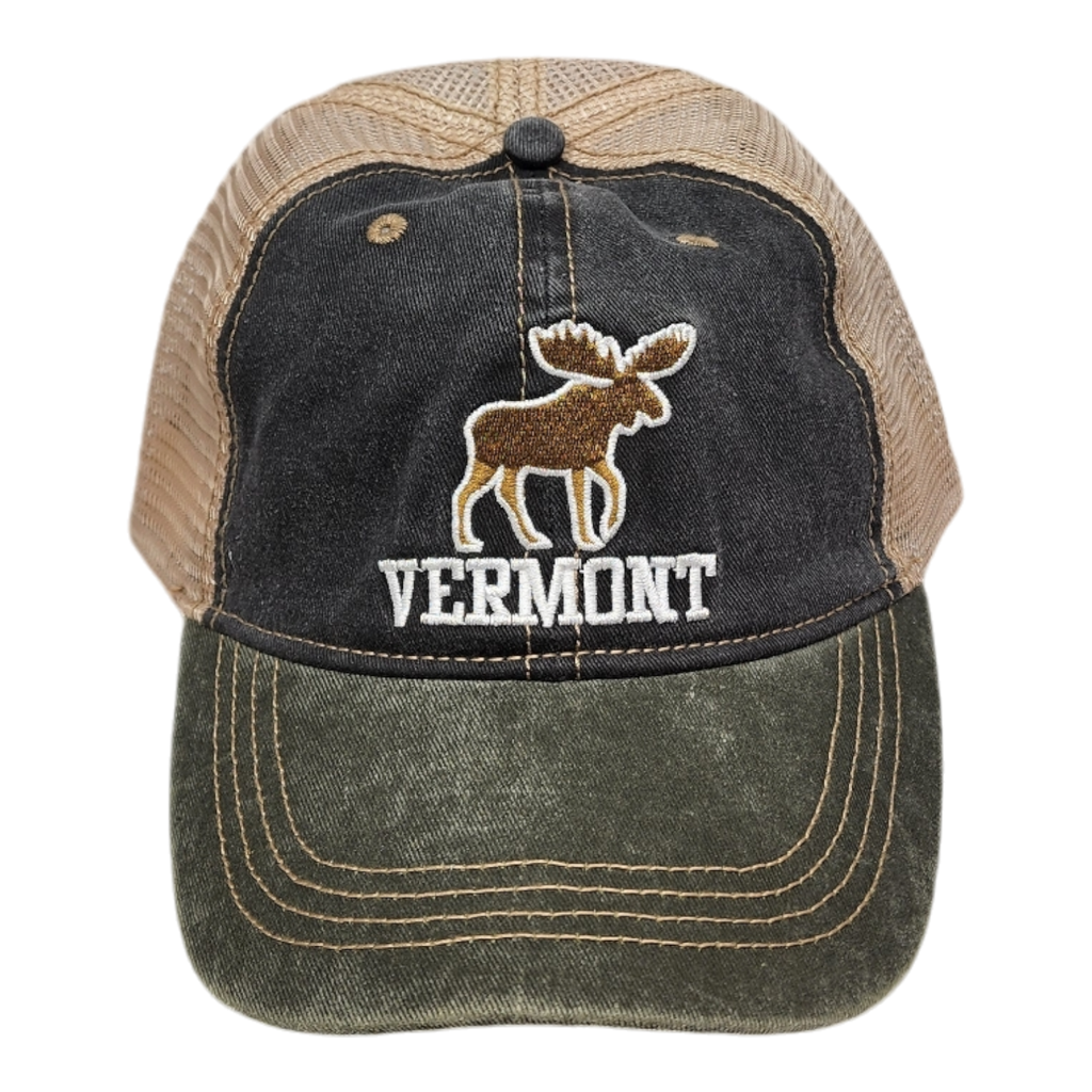 Embrace the spirit of the Green Mountain State with this stylish Vermont Cap! This trucker-style hat features a rugged design with a vintage-inspired front panel and a breathable mesh back, perfect for outdoor adventures or casual day wear. The front proudly displays an embroidered moose, symbolizing the state's rich wildlife, along with the bold "Vermont" text to show off your love for this scenic state.