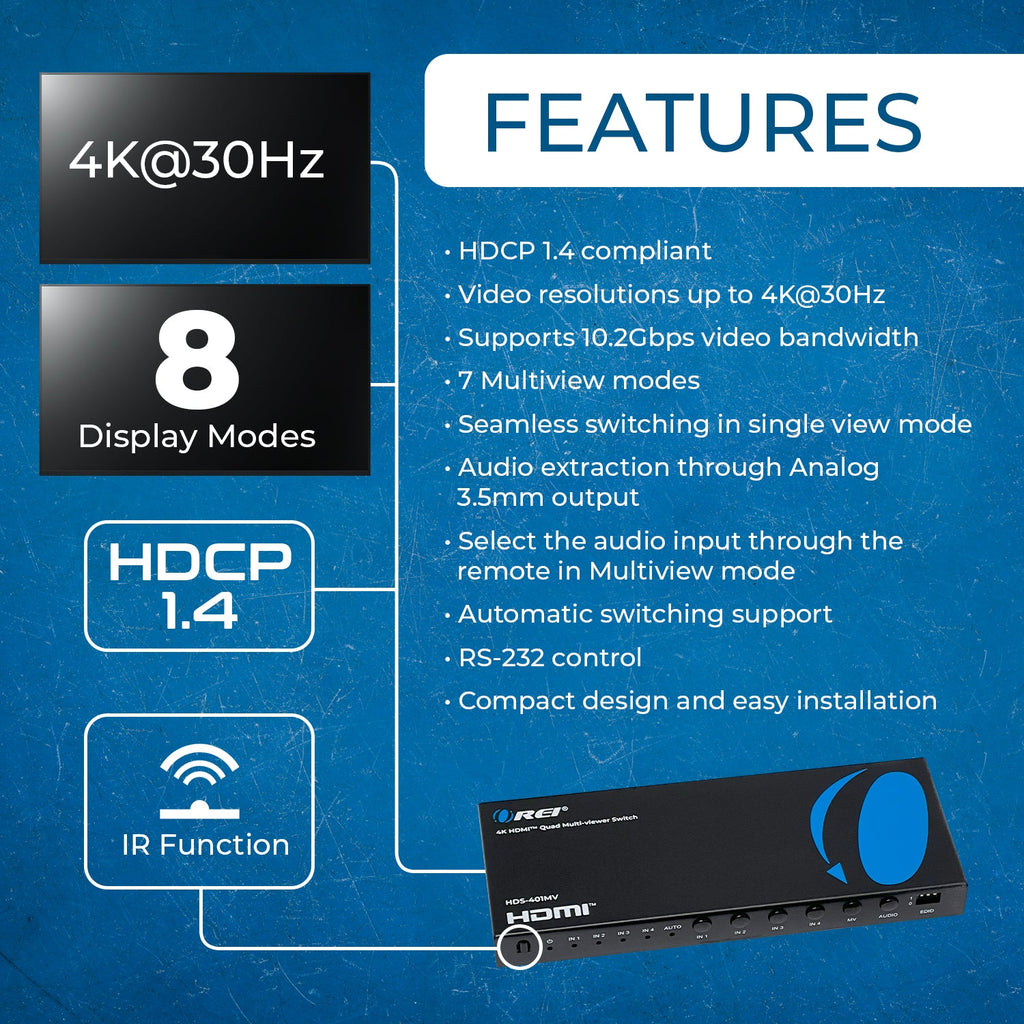 OREI HDS-401MV: 4K HDMI Quad Multi-viewer Switch 4x1 with VGA