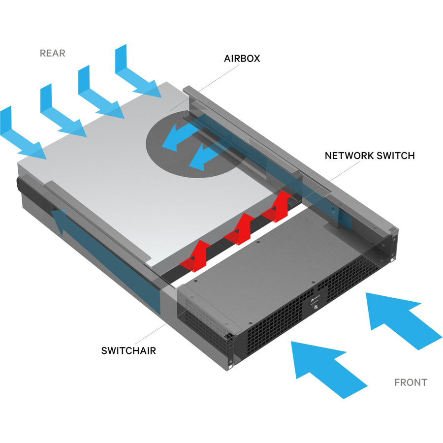 Network switches, load balancers, and routers typically sit at the top and back portion of the rack. This placement makes it difficult for cold air to travel from the front of the rack to the air intakes of the network switch equipment, increasing chances of failure over time. SwitchAir helps prevent failure by channeling cool air from the front of the rack to the air intakes regardless of where the equipment is mounted.