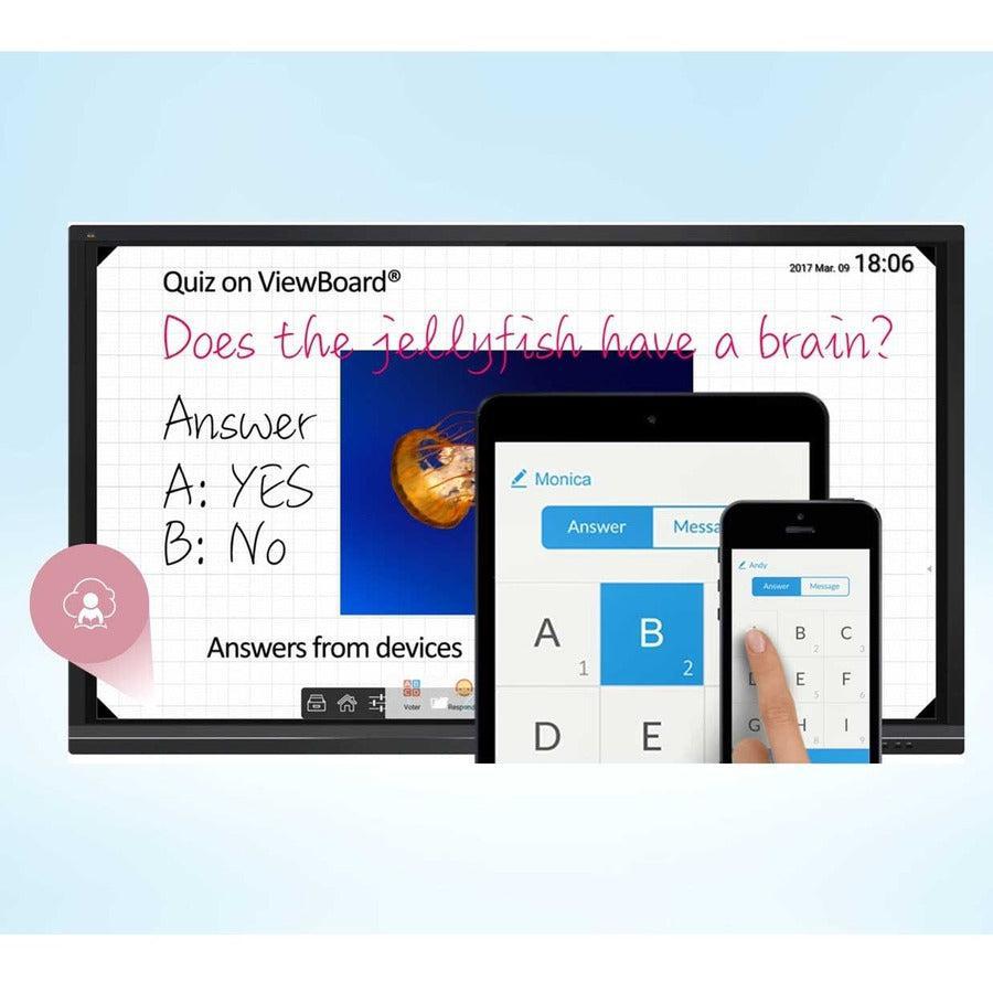 Featuring 4K Ultra HD resolution and an immersive 20-point touch screen, the ViewSonic ViewBoard IFP5550 delivers incredible collaborative capabilities for 21st century boardrooms and classrooms. With vBoard Embedded software, this 55” interactive flat panel lets multiple users write or draw on the screen with their fingers and styluses. For more robust annotation options, ViewBoard Interactive Annotation Software for Windows PC is available via a free download. With a built-in quad-core processor, as well as versatile connectivity options including multiple HDMI, VGA, RS232, RJ45, and USB ports, this display provides powerful computing for annotation and multimedia playback without the need for a PC. This display delivers optional slot-in PC capability for more computing-intensive interactive applications. The IFP5550 features a VESA-compatible design and can be placed on a wall mount, or on an optional trolley cart for flexible installation in classrooms and corporate meeting rooms.
