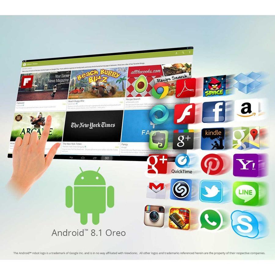 The ViewSonic® VSD243 is a 24" (23.6" viewable) smart display with Full HD 1080p resolution, Quad-Core 1.8GHz processor, 10-point capacitive touch, and Android™ Oreo 8.1 OS. Versatile connectivity options include HDMI (In/Out), multiple USB ports, SD card reader, RJ45 Ethernet, Dual Band 2.4GHz/5GHz Wi-Fi, Bluetooth4.0, 5M pixel webcam with integrated microphone, and 2.5W speakers for video conferencing. With its sleek ID, thin bezel, fan-less design, 7H hardness screen coating, and VESA compatible mounting capabilities, the VSD243 is a flexible solution for information kiosks, public displays, or POS stations in business centers, libraries, or retail environments. The VSD243 can also be operated as a stand-alone PC replacement, or as a traditional 24'' Full HD touch monitor via HDMI to your PC/Laptop. With a comprehensive set of enhanced features and functions, the VSD243 is perfect for a wide range of applications and commercial kiosk based solutions for business, restaurants, service counters, or retail environments.