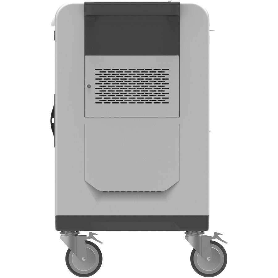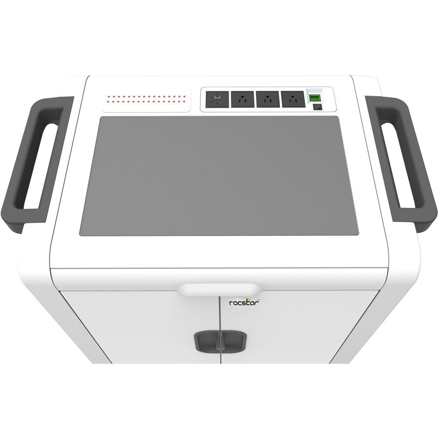Rocstor Volt SC32 is designed tosecurely Sync, Charge, and Store tablets up to 13 inch diagonal screensize. This innovative cart has a large compartment with up to 32individual, smoothedged shelves foreasy, quick, and safe loading and unloading, and a separate drawer compartment to store notebook, and power adapters