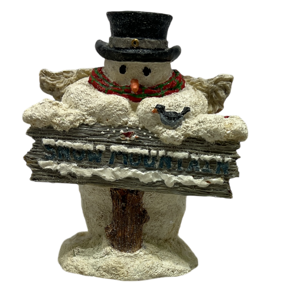 Welcome to "Snow Mountain," where the charm of winter is everlasting! This delightful MeKenna Angel Figurine features a jolly snowman holding a rustic wooden sign, complete with a dusting of snow and a cheerful bird perched on top. Standing at almost 5 inches tall, this figure is perfect for adding a dash of snowy enchantment to your holiday season.