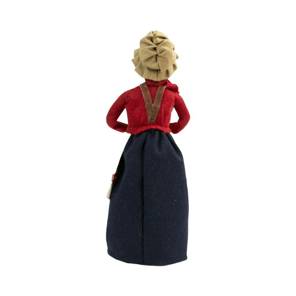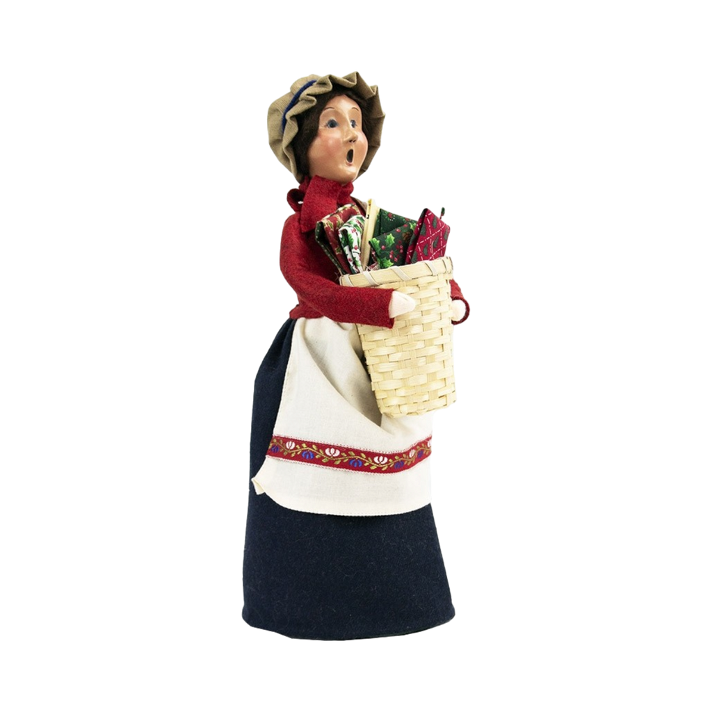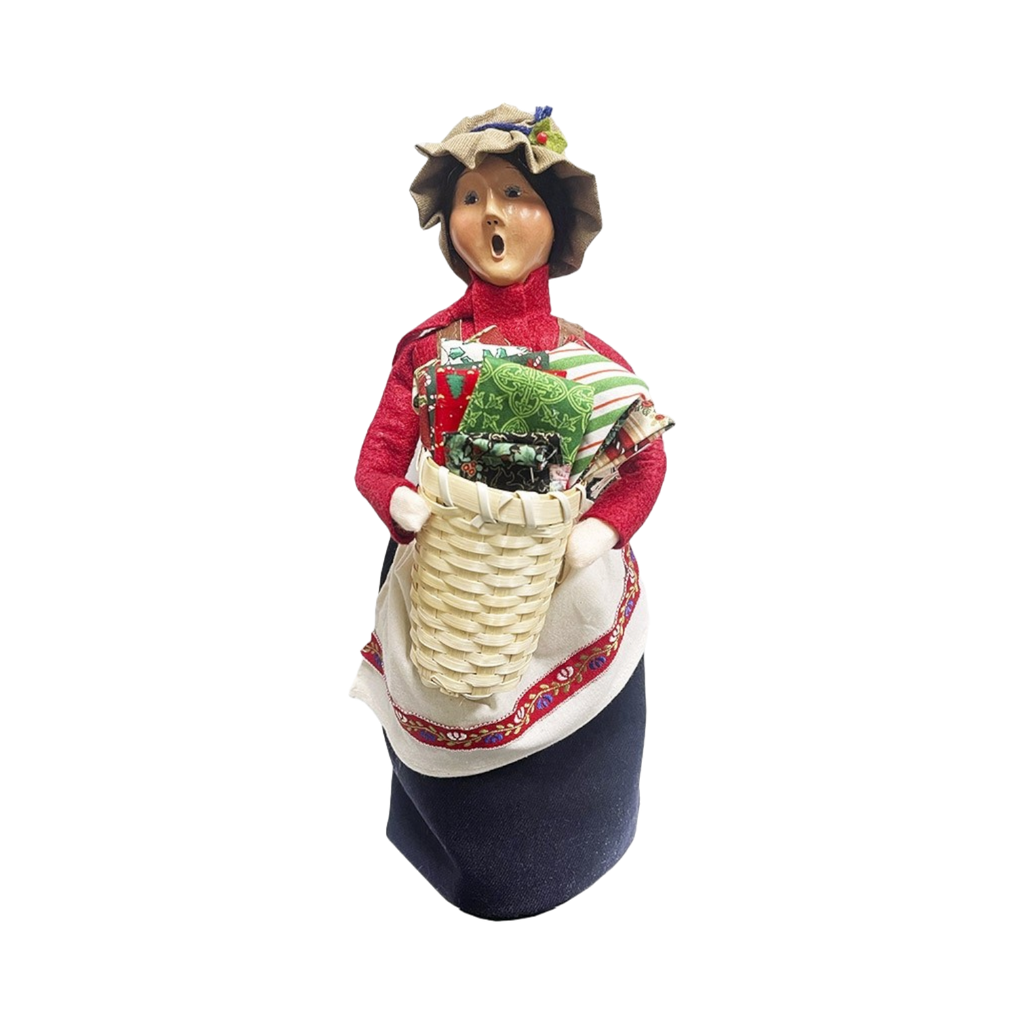 Bring home a touch of charming nostalgia with the delightful Woman Selling Fabrics figurine! Standing gracefully at 13 inches tall, this Byers’ Choice collectible is a wonderful tribute to the traditional craft of fabric selling, capturing the essence of community and creativity. Dressed in a classic red top, an apron, and a charming hat, she carries a beautifully woven basket brimming with vibrant, patterned fabrics, ready to inspire creativity in all who encounter her.