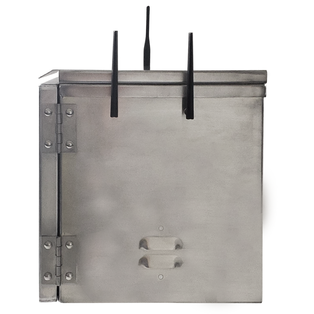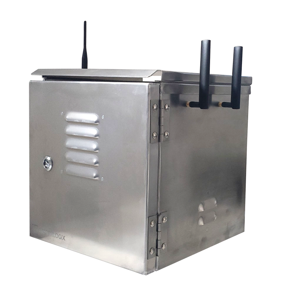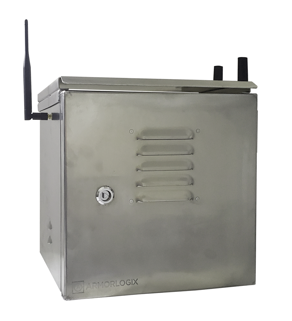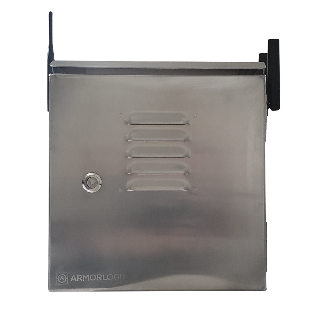 Industrial 4 port PoE switch installed inside an ArmorLogix AL121211N3-FT weatherproof NEMA 3 enclosure. ArmorLogix 4G cellular modem installed for easy, remote access, 24/7. Easily install on a wall or pole with the included universal mounting brackets.