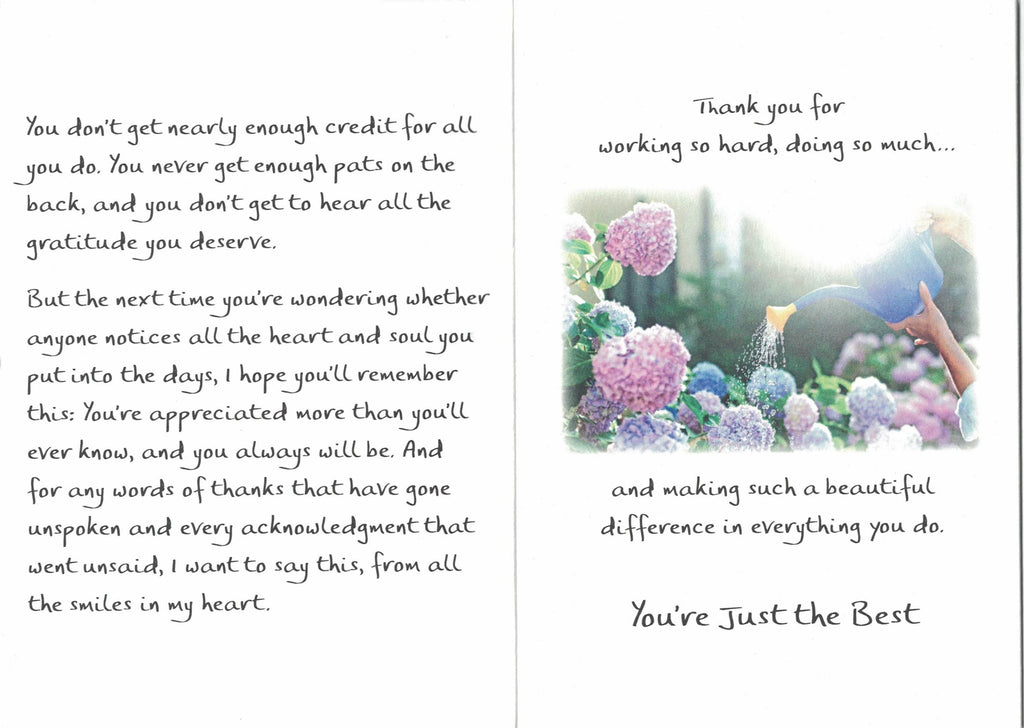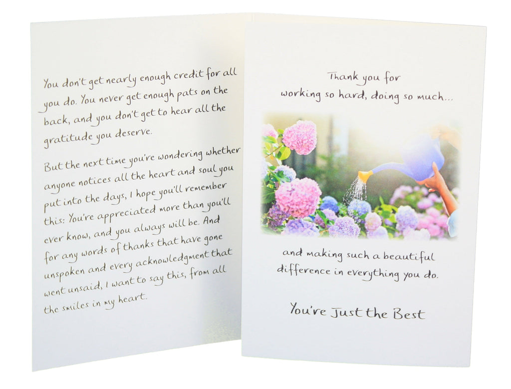 Inside Message: You don't get nearly enough credit for all you do. You never get enough pats on the back, and you don't get to hear all the gratitude you deserve. But the next time you're wondering whether anyone notices all the heart and soul you put into the days, I hope you'll remember this: You're appreciated more than you'll know, and you always will be. And for any words of thanks that have gone unspoken and every acknowledgement that went unsaid, I want to say this, from all the smiles in my heart. Thank you for working so hard, doing so much...and making such a beautiful difference in everything you do. You're Just the Best